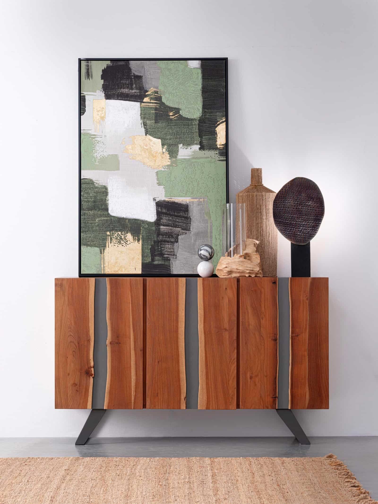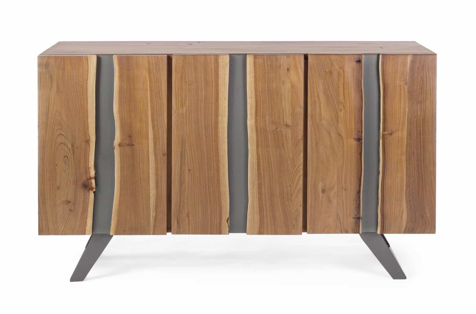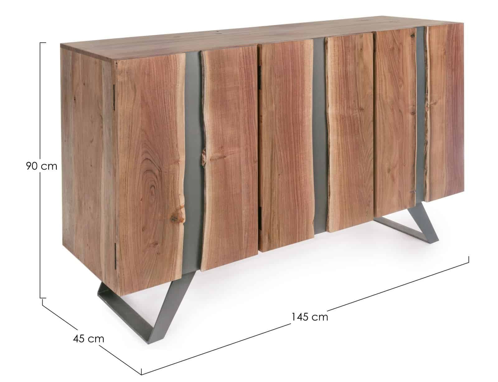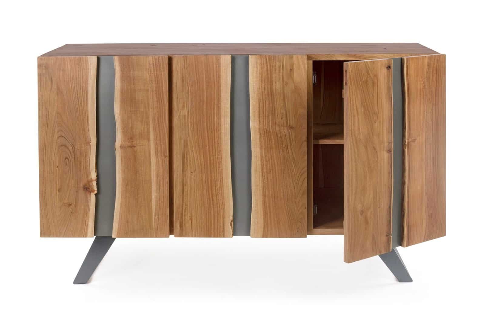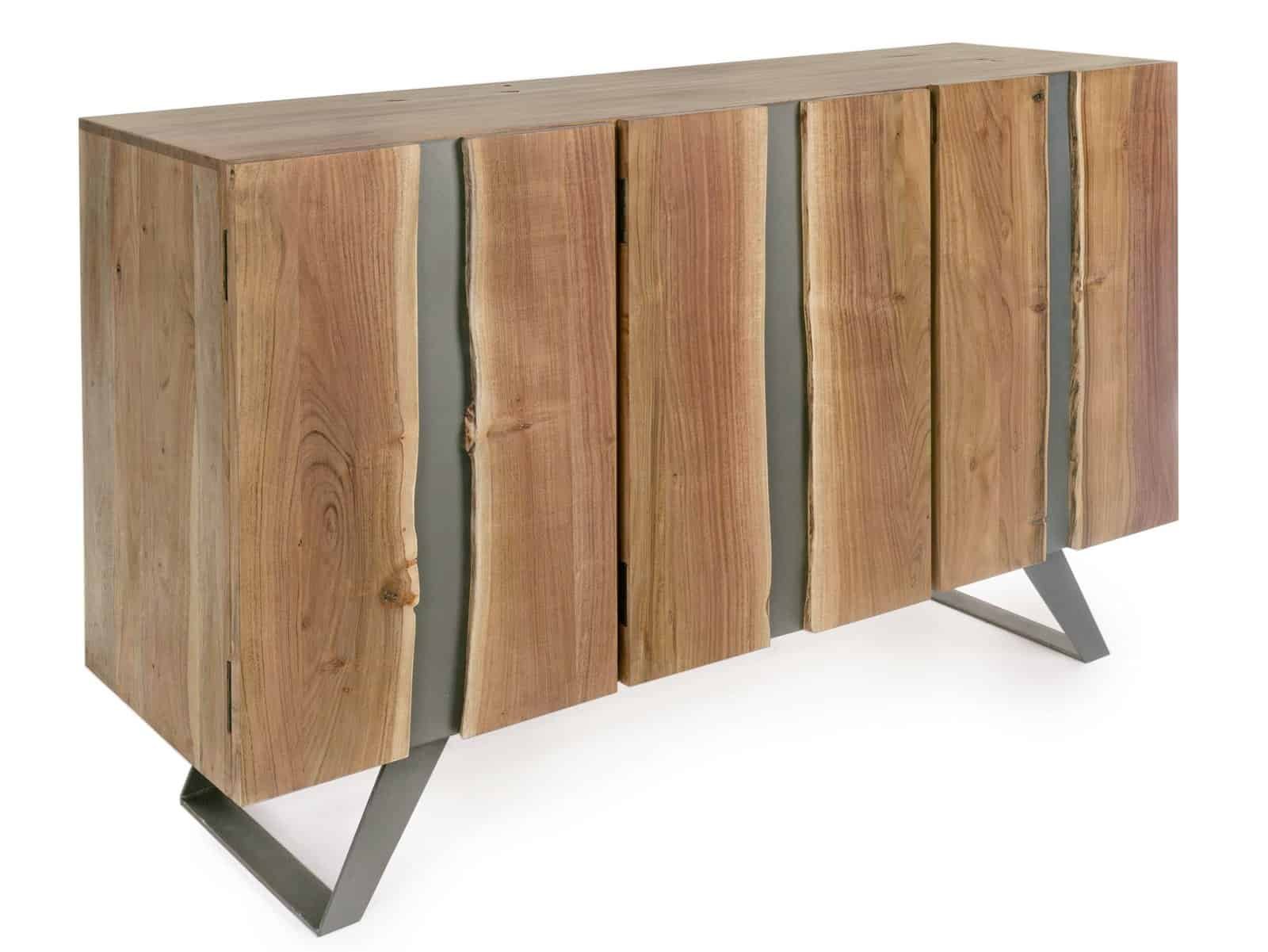 STRUTTURA IN LEGNO DI ACACIA, GAMBE IN ACCIAIO VERNICIATO A POLVERE EPOSSIDICA. PORTE CON INSERTI IN METALLO. FINITURA A BASE DI VERNICE POLIURETANICA. VANO PORTA COMPRENSIVO DI MENSOLA. GAMBE DA ASSEMBLARE.